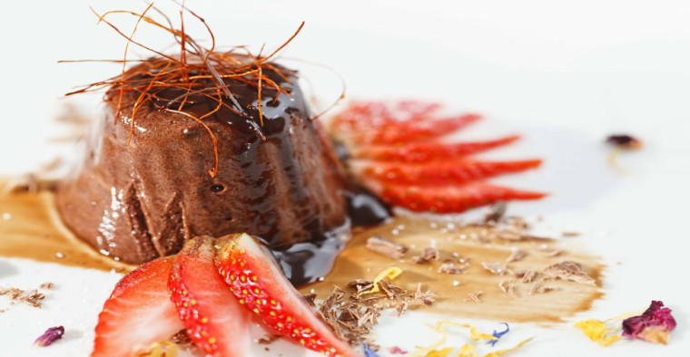 compozitia in boluri mari alaturi de fructe proaspete si spuma de ciocolata.